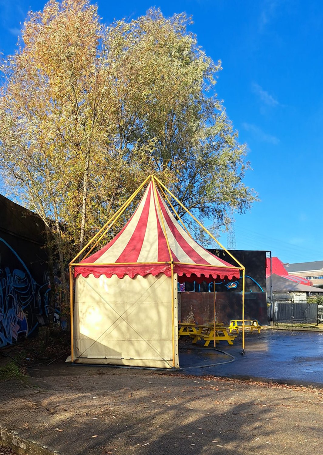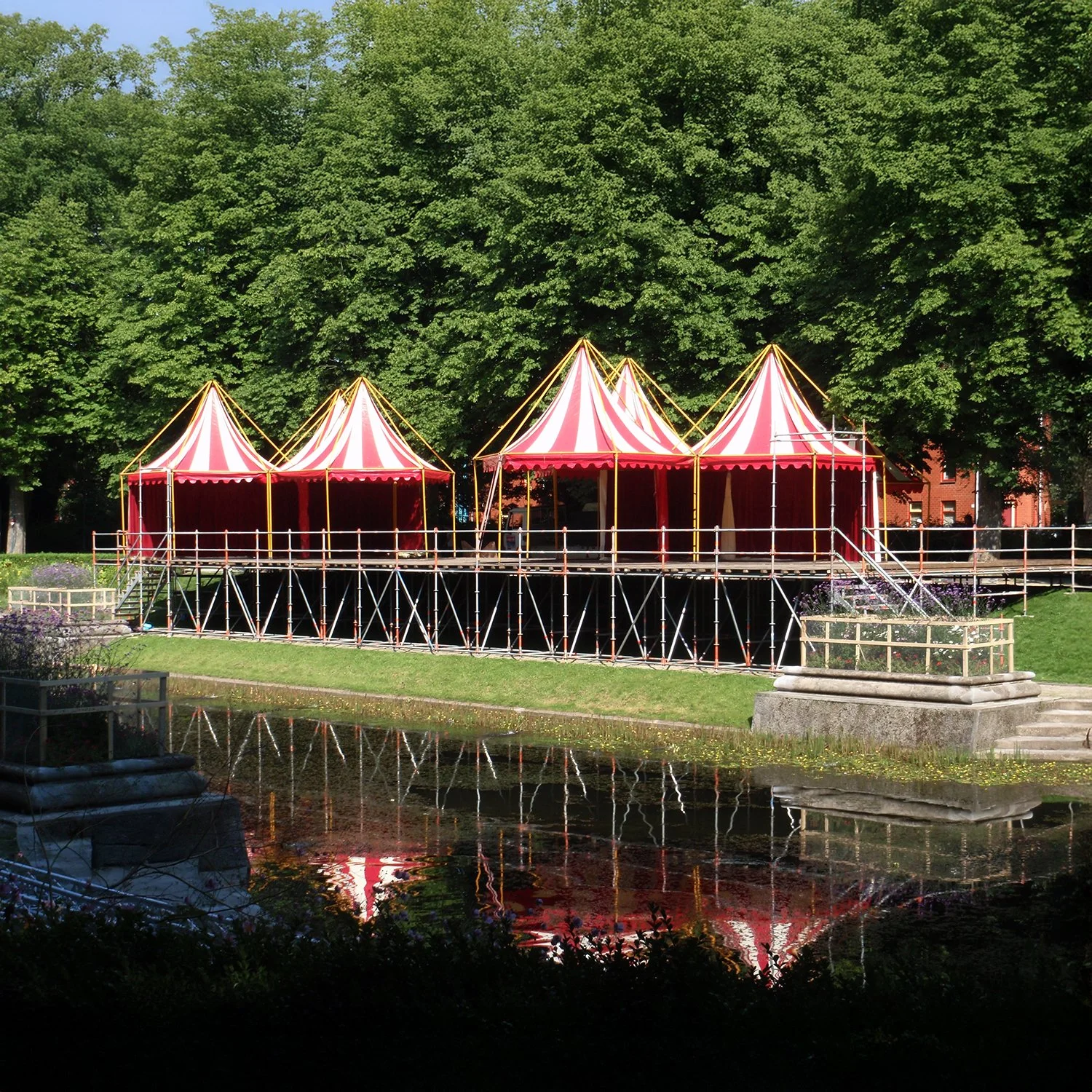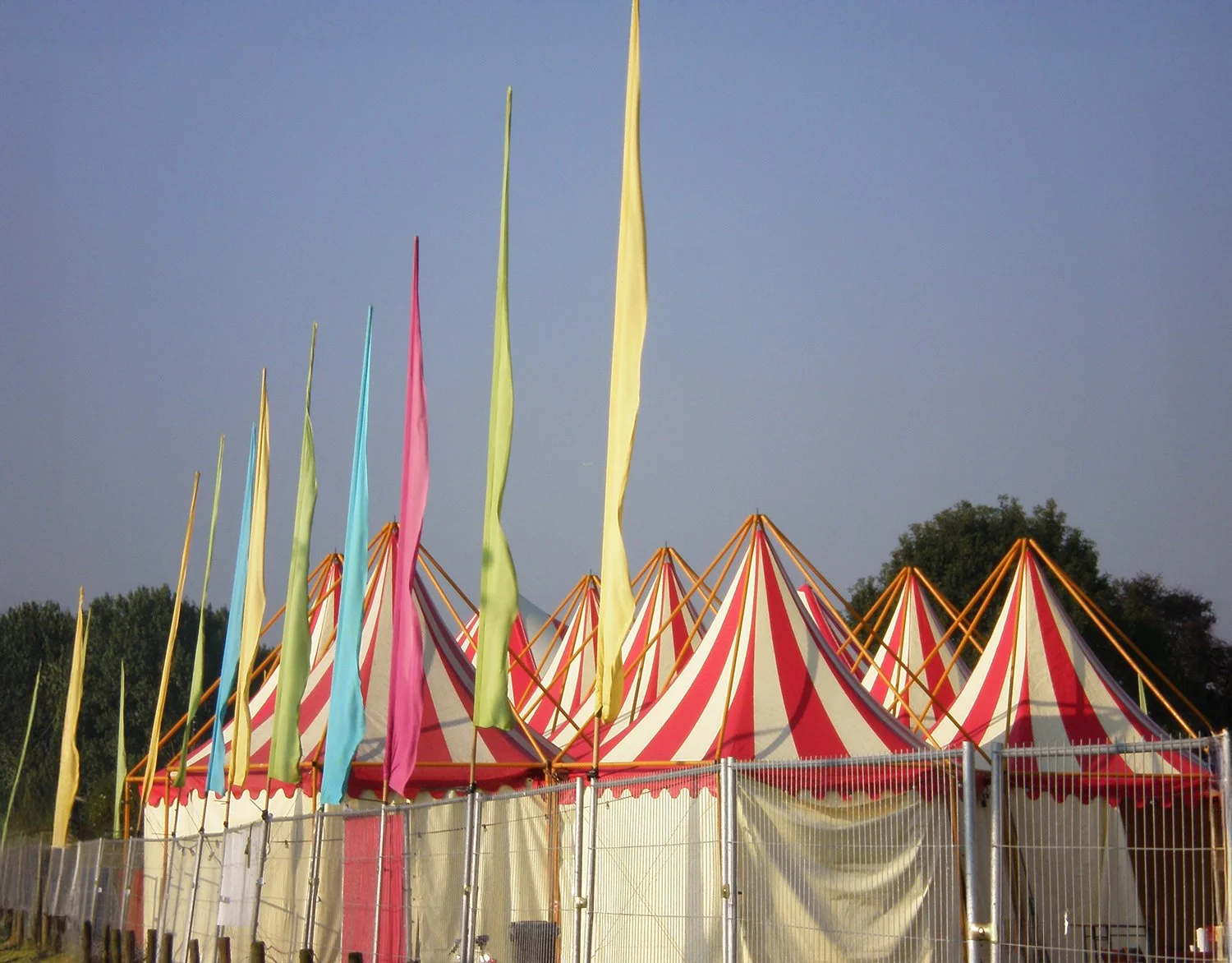 De Dwergen zijn zeshoekige tentjes met vrolijke, roodwit gestreepte puntmutsen. De Dwergen zijn koppelbaar en hierdoor zijn allerlei variaties mogelijk. De Dwergen kunnen gebruikt worden als bar- of cateringtent, maar zijn ook geschikt voor kleine workshops en optredens. We hebben speciale zeshoekige houten vloeren voor de Dwergen en er is zelfs een Dwergpodium op maat. Aankleden van de Dwergen kan met gordijn van rood velours.