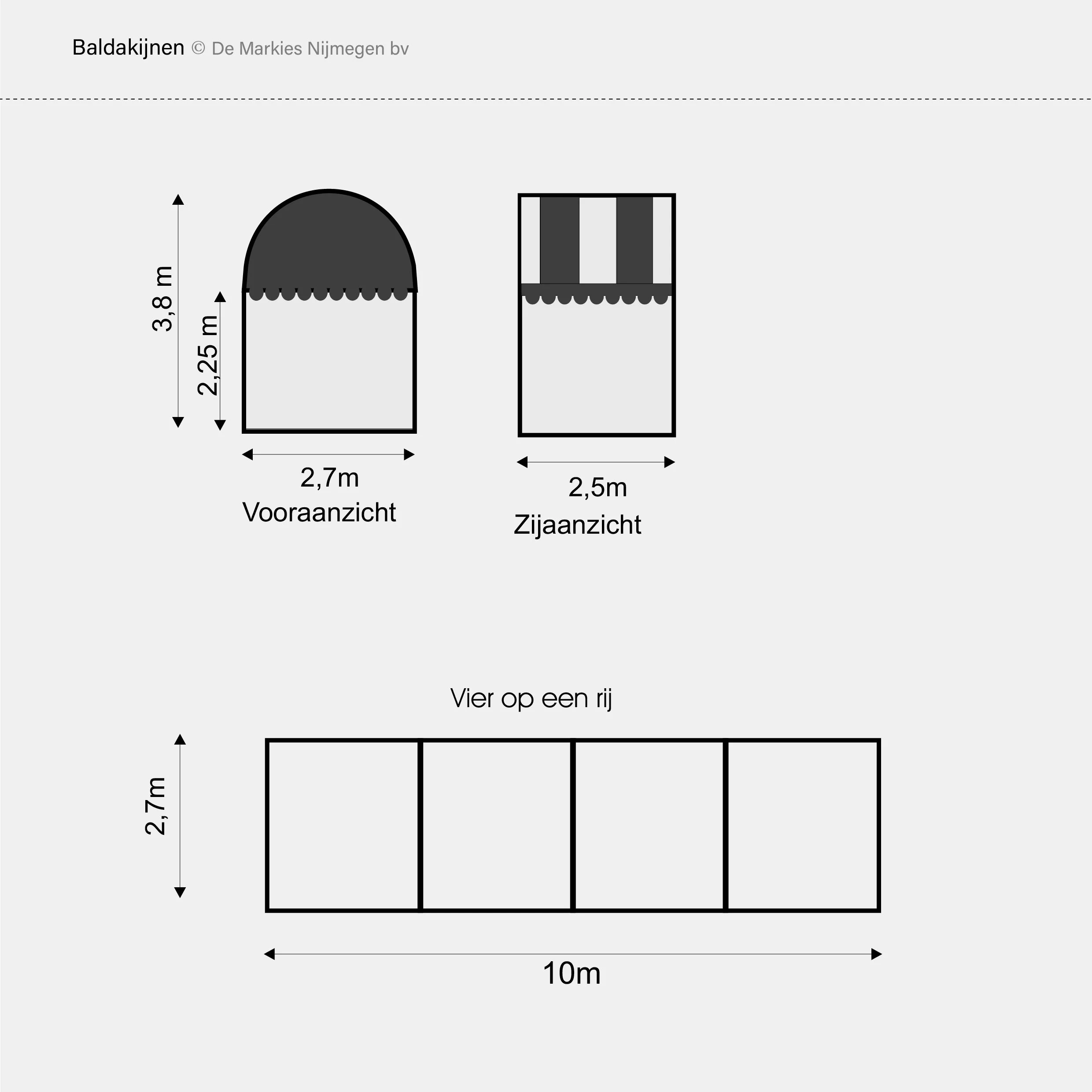 De Baldakijnen zijn boogvormige tentjes waar je alle kanten mee op kunt. Solo zijn ze te gebruiken als kassatentje, entreetje, mixpodium of verbindingssluis tussen tenten of gebouwen. Maar ook in formaties van twee, drie of vier zijn ze op vele manieren inzetbaar: als hapjestent, triomfboog, VIP-galerij, kleedkamer of bartent.